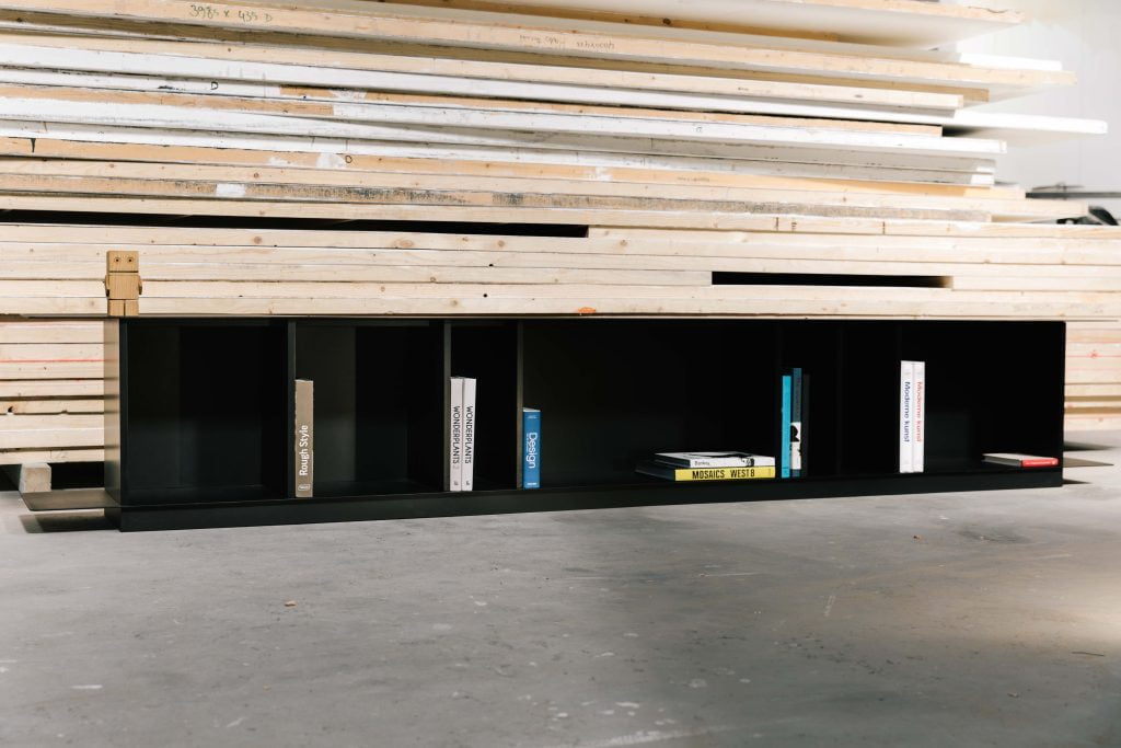 Alle verticale delen zijn gemaakt van gemaakt van hoogglans zwart gespoten MDF, de horizontale delen zijn matglas gepoedercoat staal.