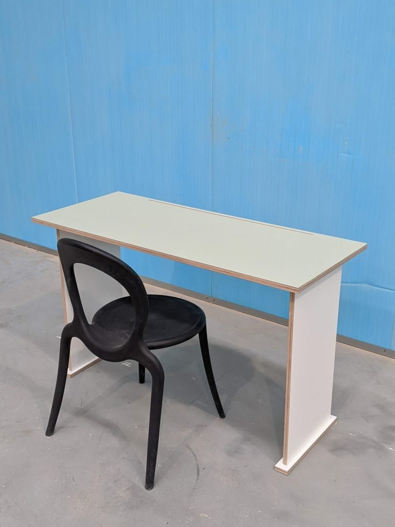 Gemaakt van berkenbetonplex in de kleur wit. Bovenzijde voorzien van fijn zacht aanvoelend forbo furniture linoleum in de kleur Pistachio.