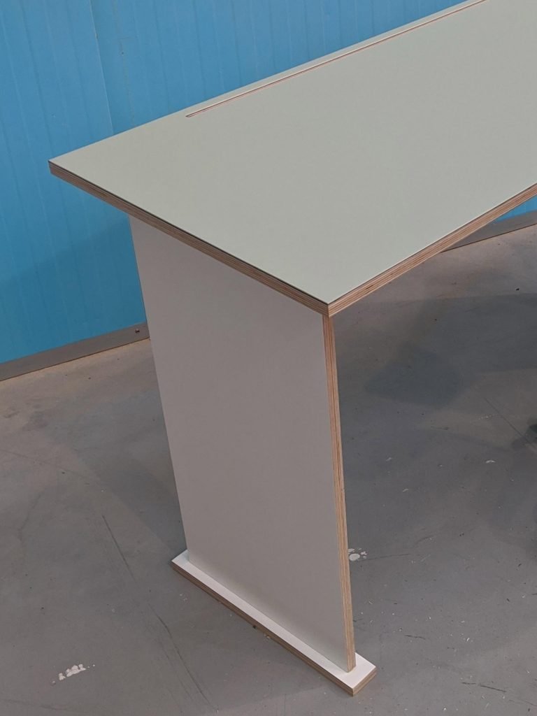 Gemaakt van berkenbetonplex in de kleur wit. Bovenzijde voorzien van fijn zacht aanvoelend forbo furniture linoleum in de kleur Pistachio.