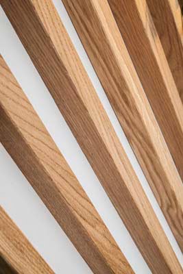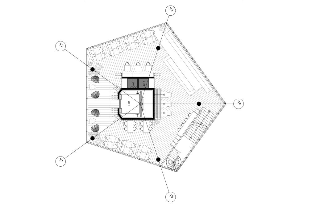 De kern met daarin de lift is bekleed met houten latten met daarin planten. Daaromheen zijn veel verschillende en kleurige zitjes gecreëerd op het “houten dek”.
